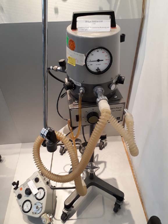 etwa 1970 Von Roger Manley 1961 entwickelt. Der Beatmungsdruck wurde mit dem Gewicht auf der graduierten Schiene eingestellt.