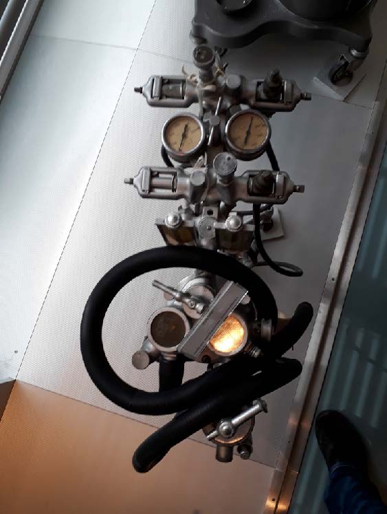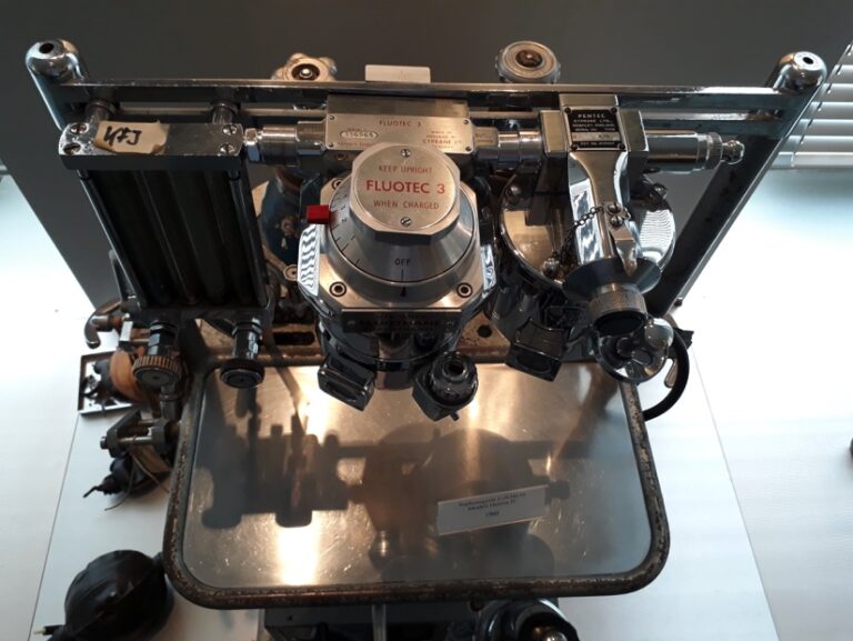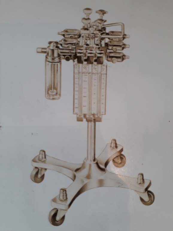 1950er Jahre The Australien Midget on Stand 1950er Jahre. Mit den Foregger „hydraulic flowmeters“ (Aquameters). Der Namensgeber dieses Narkosegrätes war der österreichische Chemiker Richard von