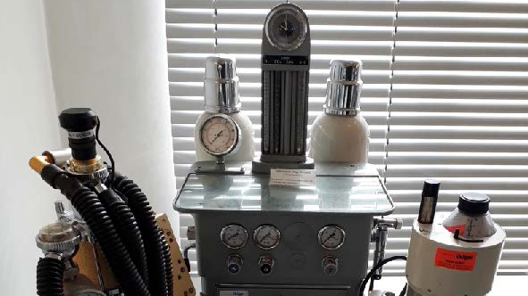 1962 Rotameter für O2, N2O und Cyclopropan. Beatmungsgerät Pulmomat (1953).